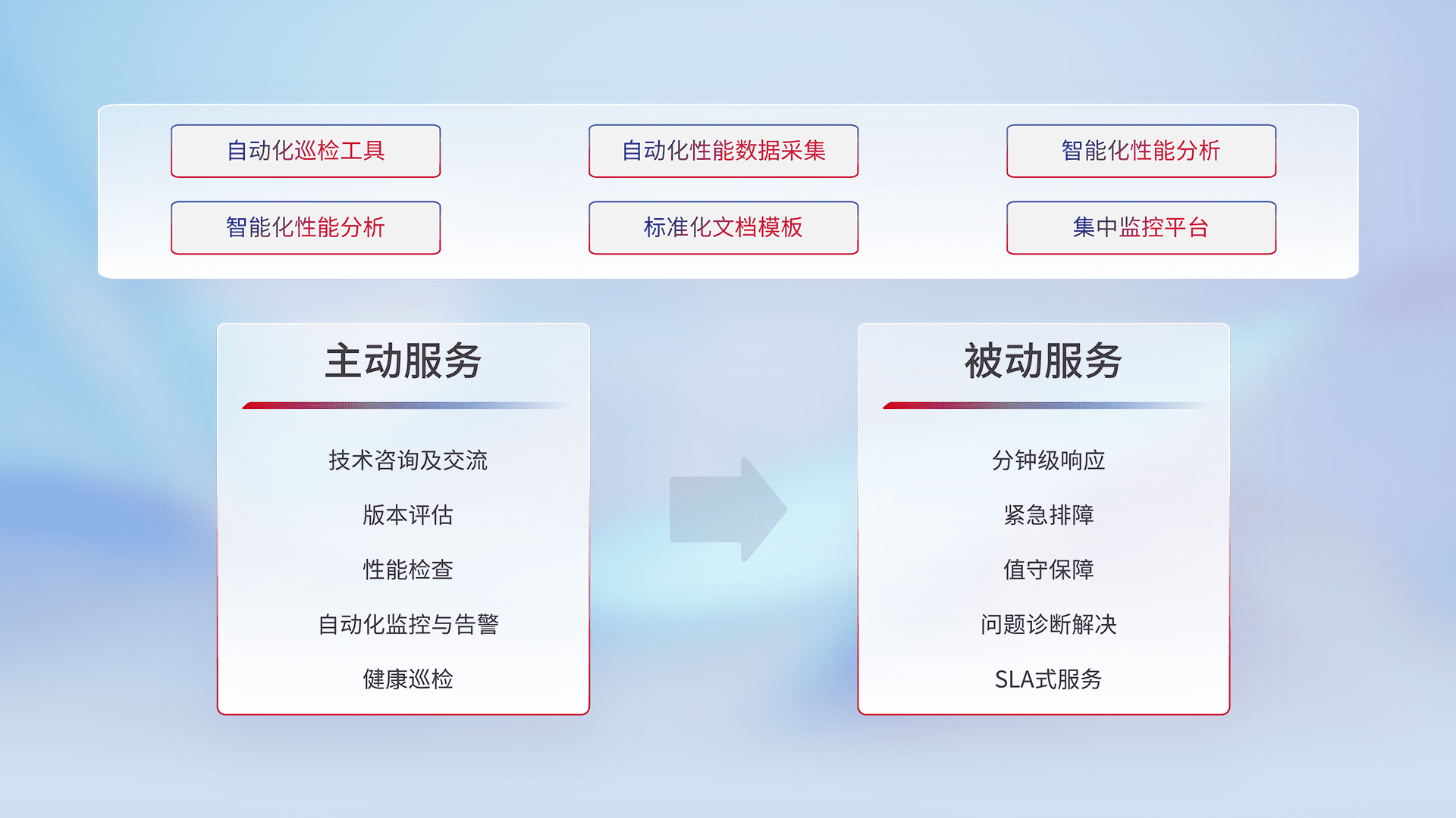 智能化工具和标准化文档,,,,保障服务质量,,提供主动服务(包含技术咨询、、版本评估、、性能检查、、自动化监控与告警、、、健康巡检)和被动服务包含(分钟级响应、、紧急排障、、值守保障、、、问题诊断解决、、、SLA服务)。。